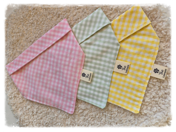 Fresh, cheerful, and made for sunny adventures — the Loempie Spring Gingham Dog Bandana brings classic charm to your pup’s wardrobe. Featuring a timeless gingham pattern in soft yellow, blush pink, and calming sage green, this bandana captures the sweetness of spring in every stitch.